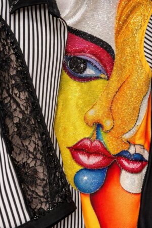 - Statement Design: A classic pinstripe button-down shirt, elevated with bold, sparkling sequin and bead appliqués for a contemporary, eye-catching look.