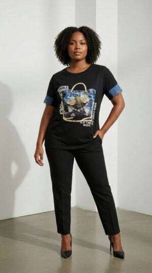 Premium Graphic Print Blouse with Denim Accents