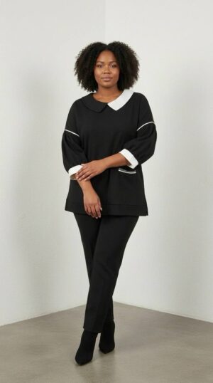 Contrast Collar Wide-Sleeve Tunic Blouse