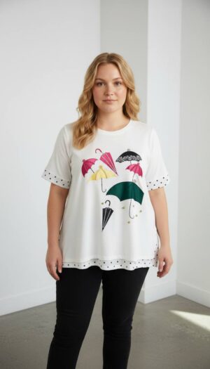 Elegant Umbrella Graphic Blouse with Polka Dot Trim